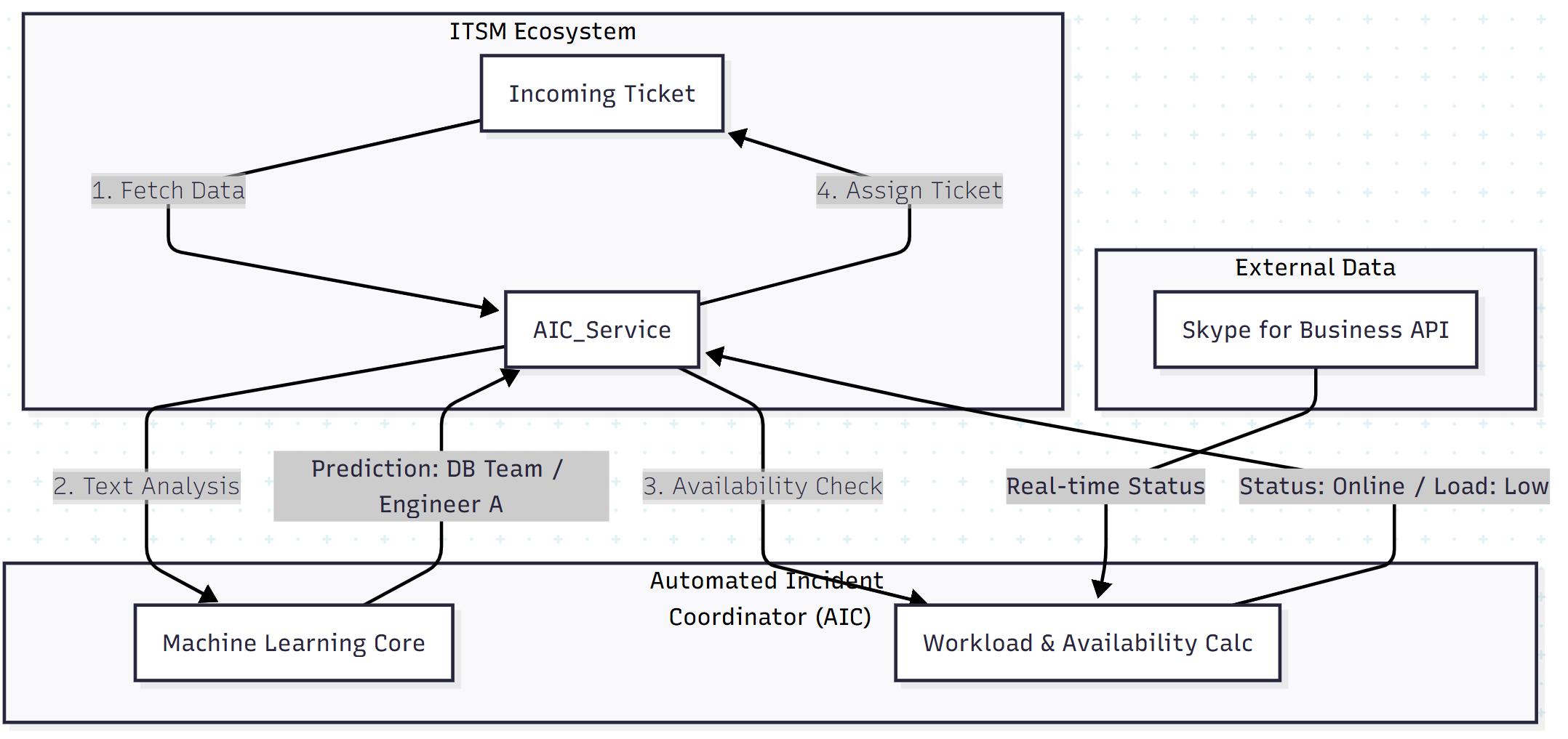 Availability: It queries the Skype for Business API (or Teams/Slack APIs) to check presence status. If the ML model selects “Engineer Bob” but Bob is marked as “Away,” the system moves to the next best candidate.
