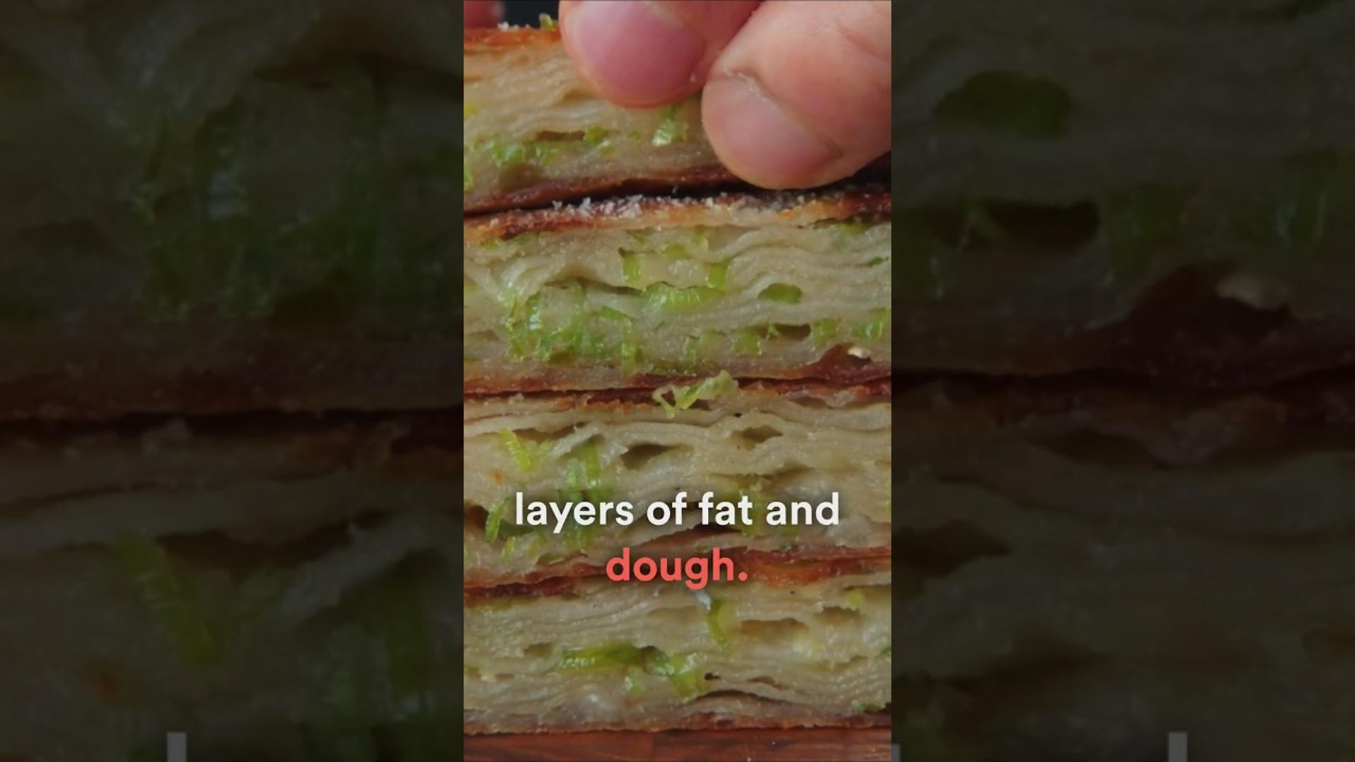 The video walks viewers through a step‑by‑step method for producing ultra‑flaky scallion pancakes that rival those served in Chinese restaurants. It emphasizes three core techniques—hot‑water dough, a pasta‑roller for consistent sheets, and a hot‑oil‑flour paste—to create distinct, alternating layers of fat and dough. The hot‑water dough partially gelatinizes starch, yielding a tender, moisture‑retaining crumb while reducing gluten strength enough for easy shaping. A blend of high‑gluten flour and low‑gluten flour mimics traditional Chinese “flower” blends. The dough rests 15 minutes, then 45 minutes to two hours, allowing gluten relaxation. The oil‑flour paste, thickened with flour and infused with scallions, Sichuan peppercorn, and toasted sesame oil, provides a stable lamination that doesn’t bleed during rolling. Using a pasta machine, the dough is rolled to about 1 mm thickness, trimmed, brushed with the paste, and layered with two sheets per pancake. After folding and sealing, the pancakes rest overnight, freeze‑firm for 30 minutes, then cook covered medium heat for 2–3 minutes per side before finishing uncovered to achieve a deep golden crust. The host demonstrates ten visible layers and contrasts them with a denser, squashed restaurant version. By combining professional‑grade techniques with accessible kitchen tools, the recipe enables home cooks and small‑scale chefs to deliver restaurant‑level texture and flavor, opening opportunities for menu differentiation and elevated casual dining experiences.