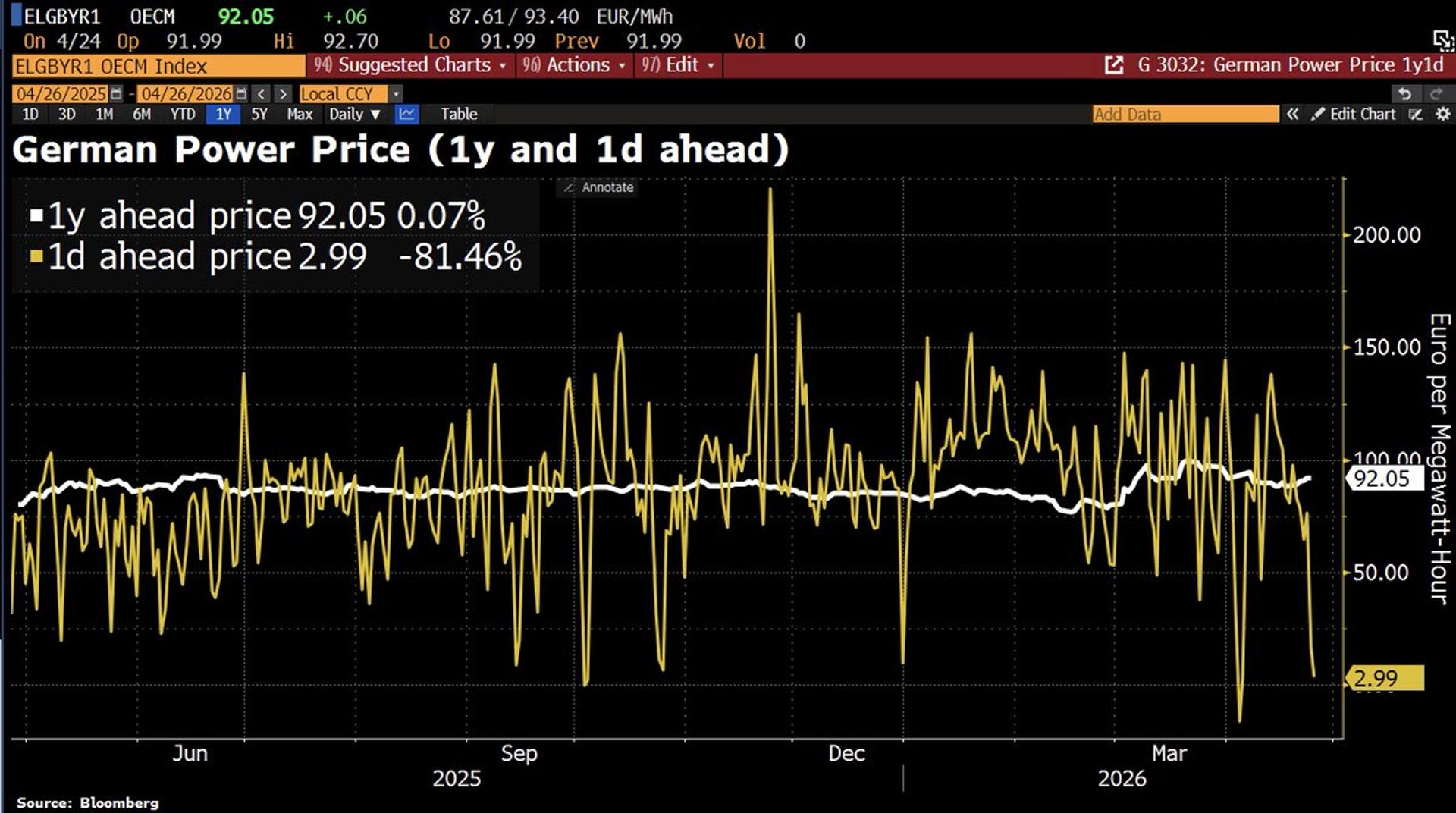 Good Morning from Germany, where households are footing the bill for the energy transition. The benchmark 1y-ahead power price is back near €100/MWh, or 10c/kWh, even though spot prices briefly turned negative. Add 23c in charges and levies, and households end up paying more than 30c/kWh.