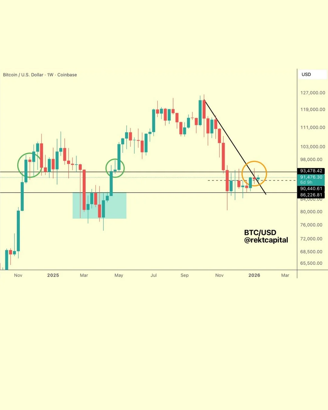 #BTC The main goal for Bitcoin going forward is to turn the late November/early December 2025 highs into new support (i.e. $90500) to springboard above $93500 to perform a post-breakout retest like in previous green circles $BTC #Crypto #Bitcoin ๐Followย @rektcapitalย for more level-headed...