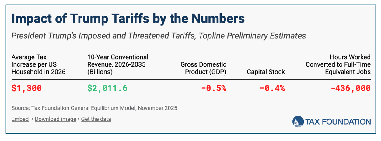 President Trump has imposed International Emergency Economic Powers Act (IEEPA) tariffs on US trading partners, including China, Canada, Mexico, and the EU. In addition, he has threatened and imposed Section 232 tariffs on autos, heavy trucks, steel, aluminum, lumber, furniture, semiconductors, pharmaceuticals, and copper, among others. The Trump tariffs amount to an average tax increase per US household of $1,000 in 2025 and $1,300 in 2026. Under the tariffs imposed and scheduled as of February 6, 2026, the weighted average applied tariff rate on all imports rises to 13.5 percent, and the average effective tariff rate, reflecting behavioral responses, rises to 9.9 percent—the highest average rate since 1946. The Trump tariffs are the largest US tax increase as a percent of GDP (0.54 percent for 2026) since 1993. Trump’s imposed tariffs will raise $2.0 trillion in revenue from 2026-2035 on a conventional basis and reduce US GDP by 0.5 percent, all before foreign retaliation. Accounting for negative economic effects, the revenue raised by the tariffs falls to $1.6 trillion over the next decade. We estimate that the tariffs raised $132 billion in net tax revenue in 2025. The Trump tariffs threaten to offset much of the economic benefits of the new tax cuts, while falling short of paying for them.