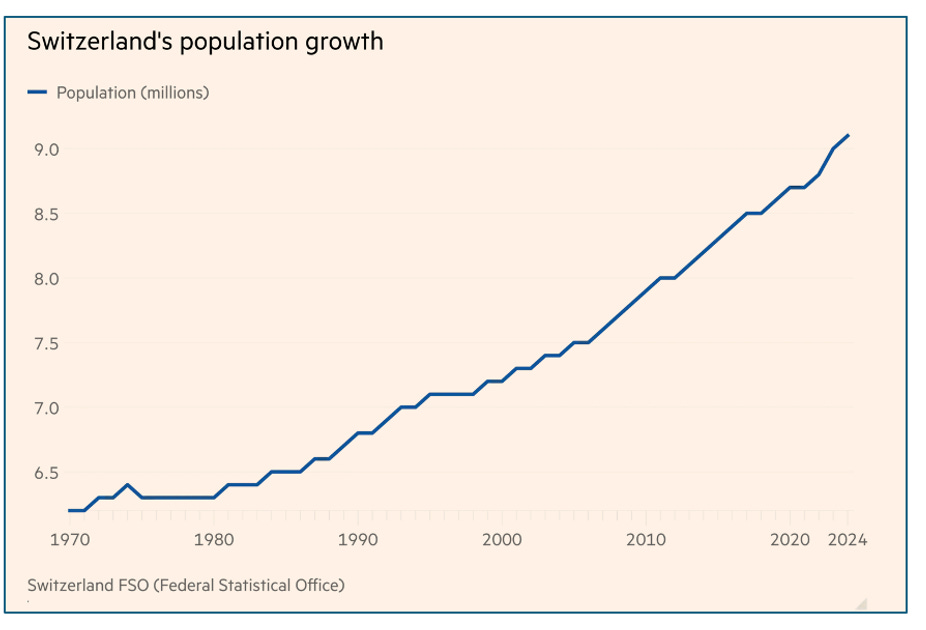 Switzerland will hold a vote on a radical proposal to cap the country’s population at 10mn people, a move that could threaten crucial agreements with the EU and limit companies’ access to skilled foreign workers. The country’s current population is 9.1 million people, and Switzerland has a high level of immigration, as people are drawn by its high wages and quality of life. It has one of the largest proportions of foreign residents in Europe, at 27% according to official figures, and its population has grown by some 25% since 2000, much higher than most neighboring countries.
