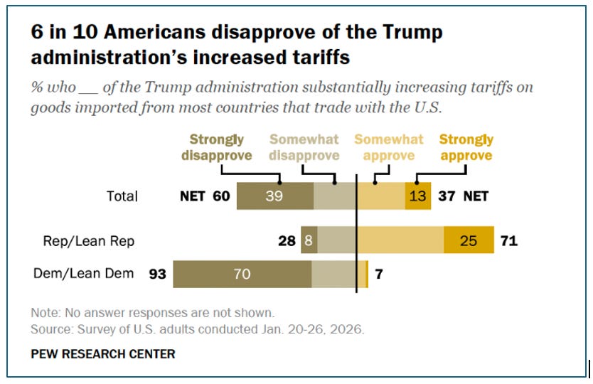 By a wide margin, Americans continue to say they disapprove of the Trump Administration substantially increasing tariffs: 60% say, including 39% who say they strongly disapprove. By contrast, 37% say they approve of the increased tariffs, and just 13% strongly approve. Views of the Administration’s tariff increase have been relatively stable since last April, when President Donald Trump unveiled his far-reaching tariff policy.