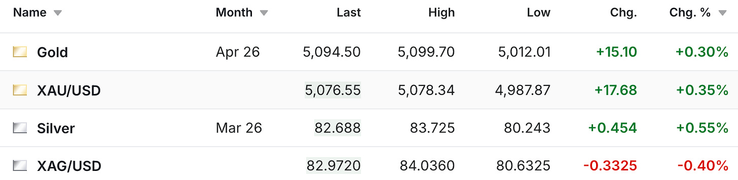 It’s somewhat of a quiet morning in terms of the gold and silver pricing, at least relative to what we’ve grown accustomed to over the past year, with the gold futures up $15 to $5,094, while the silver futures are up 45 cents to $82.69.