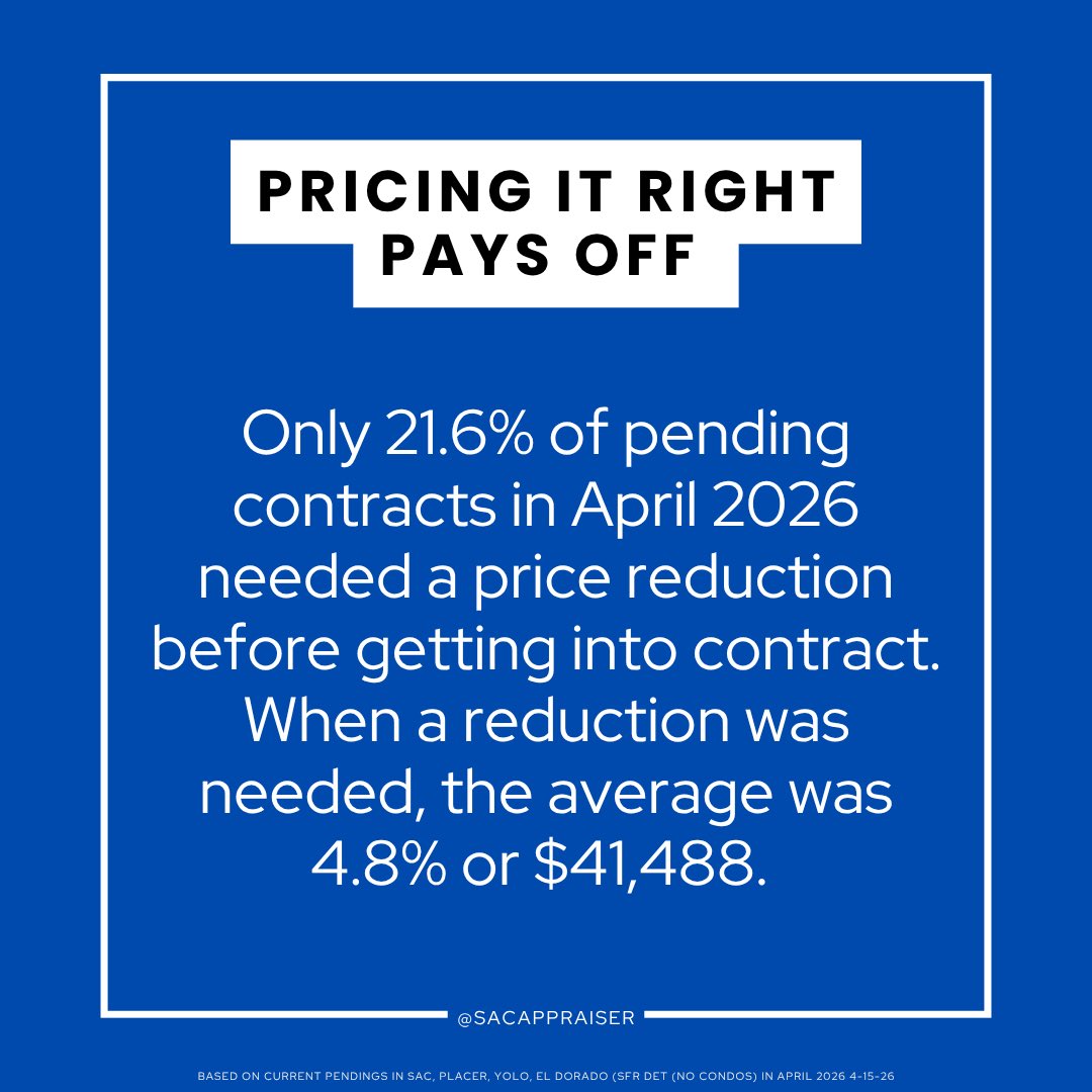 Overpricing is not working, but buyers respond to well-priced homes. Only 21.6% of pendings needed a reduction before getting into contract in April. In contrast, 33.7% of active listings in the Sacramento region have had a price reduction. https://t.co/x4ayQ8T7U2